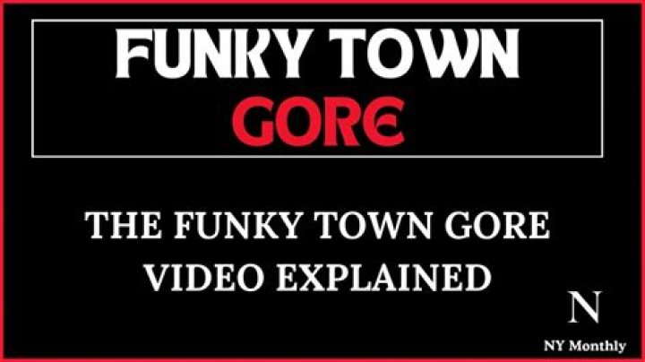 Answer: "Also funky town gore" refers to graphic and disturbing content, often involving extreme violence and gore, accompanied by the electronic music track "Funkytown" by Lipps Inc.